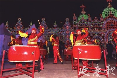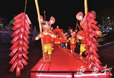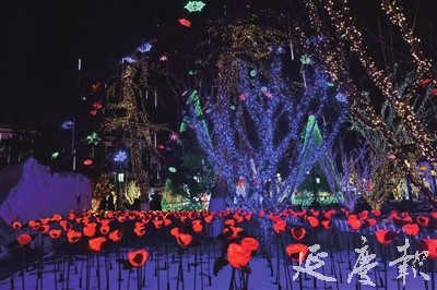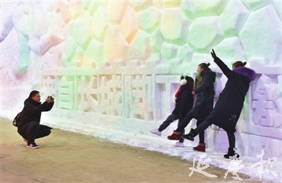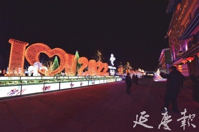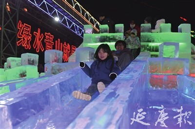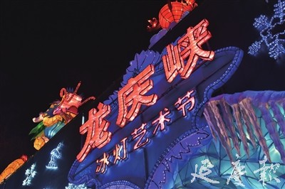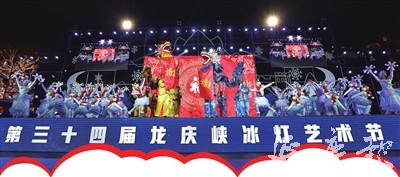 还未进入景区,远远望去,山顶上蜿蜒的灯光组成绚烂的光影长城,山体上各色灯光旖旎,“龙庆峡”三个大字流光溢彩,苍劲有力。景区内,树木枝丫披上流光,一栋栋建筑被彩灯勾勒出精致轮廓,道路两侧水晶冰灯光彩夺目,指引着游人走进一个多彩的冰雪世界。