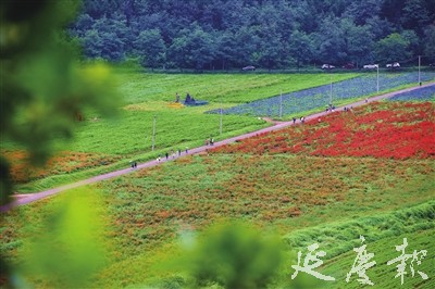 脚下镂金铺翠,举目环视,姹紫嫣红的数千亩鲜花铺展开来,仿若烟花满天落入凡尘。五颜六色的波斯菊、淡紫飘香的马鞭草、似火骄阳的串儿红……花簇锦攒迷人眼。形色各异的花卉争奇斗艳,汇成一条彩色的河流,在山谷间,犹如打翻了“调色盘”,渲染出如诗如梦的画卷。