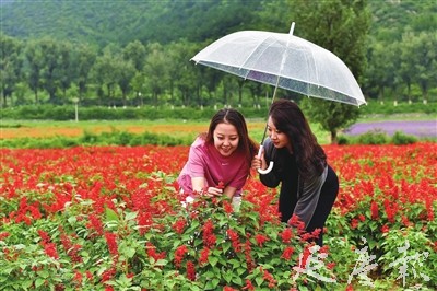 微风习习,馨香四溢。慕名而来的游人三五成群,相互追逐嬉戏,笑靥朦胧。撑一把伞,赶着斜风细雨,沿花海漫步。一朵朵鲜花翘首企盼,静待着游人低头寻香。风中,花朵们随风摇曳,轻如蝉翼的花瓣如同热情的双手,在风中挥舞,像是欢迎远方客人的到来。