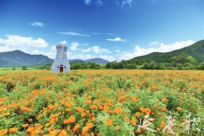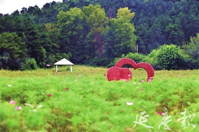 朦胧的雨雾中,红顶白墙的乡村镶嵌在青葱翠绿中,点缀了大自然的鬼斧神工。“爱之门”“大风车”“爱的音符”……与花海相融交汇,浪漫的气息扑面而来。