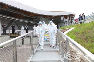 10月8日下午2时30分,国家雪车雪橇中心开展了雪车和钢架雪车国际训练周首次医疗应急演练。演练场景设定为在赛道第15弯道处,双人雪车运动员发生翻车事故,其中一名运动员为轻伤,可自行走出赛道,另一名运动员意识丧失,无法自行脱离雪车。医疗团队联合体育业务领域、场馆业主,在赛道开展实地救援演练。